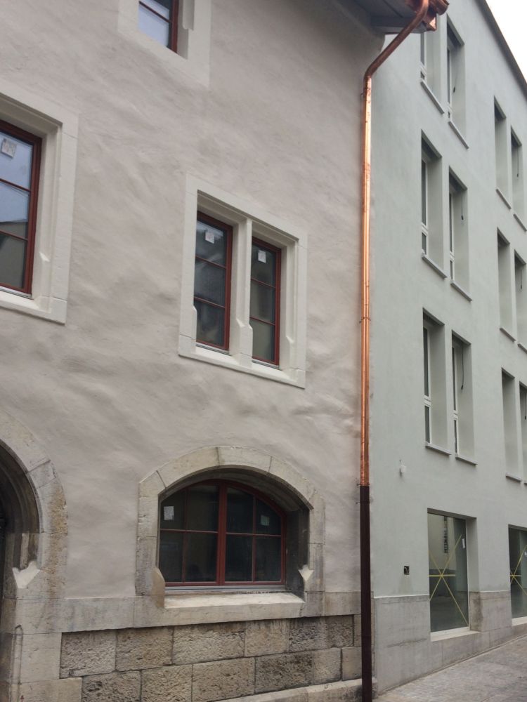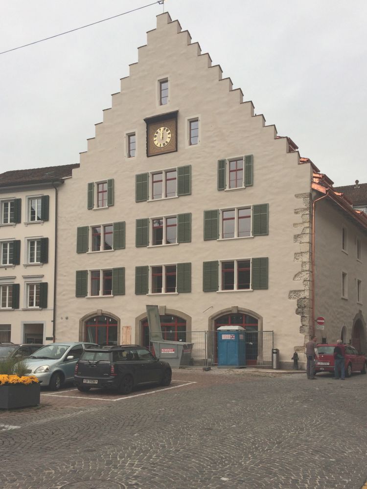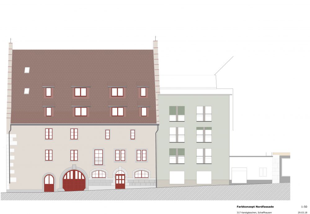 Die Konstanzische Schütte am heutigen „Platz“ wurde in spätmittelalterlicher Zeit als Kornschütte und Lagerhaus erstellt. Die Fassade mit dem markanten Treppengiebel prägt den Ort. Die geplante Farbgkeit für die Renovation beruhte ursprünglich auf dem Befund. Auf eine Rückführung auf den Zustand im 19. Jahrhundert wurde aber verzichtet. Vielmehr sollte die Präsenz am Platz, beruhend auf den Erkenntnissen der eigens für Schaffhausen erstellten Farbkarte Altstadt, gestärkt werden. Die Farbtöne für die Fassade der Schütte und des daran anschliessenden Neubaus im Karstgässchen wurden auf der Basis von Kalk und Erdpigmenten entwickelt. Umgesetzt wurde der feine umbragraue Farbton in einer titandioxidfreien Farbe, die die Fassade in jeder Lichtsituation anders erscheinen lässt.
